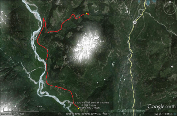 A guy at work had recommended High Falls Creek up the Squamish Valley so I pulled up Google Earth, did some Google searching, and put together plans for an overnight mountain biking trip. I was going to circumnavigate Cloudburst Mountain by riding up the gravel road to the pass at Tricouni, then descend down the other side to the Cheakamus Valley, and then climb back up over to the Squamish Valley, where I left my car.