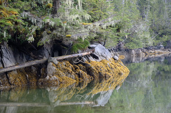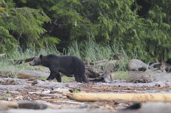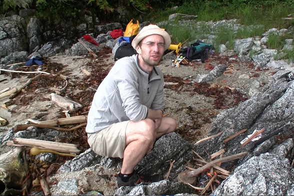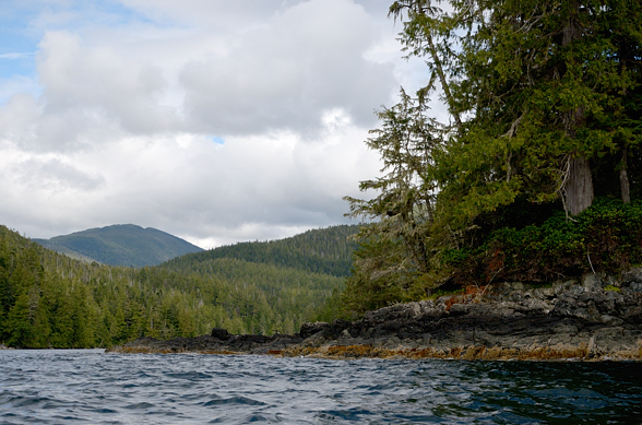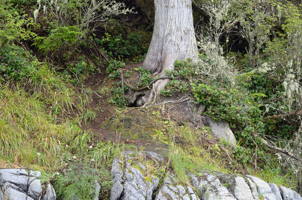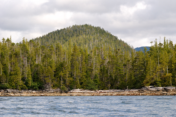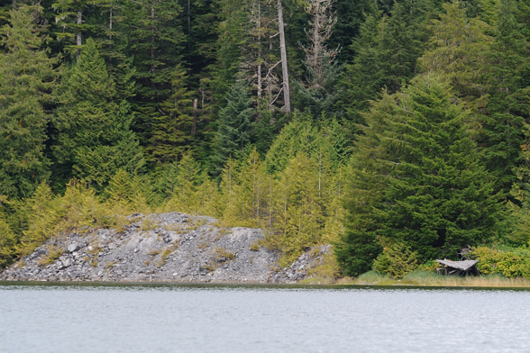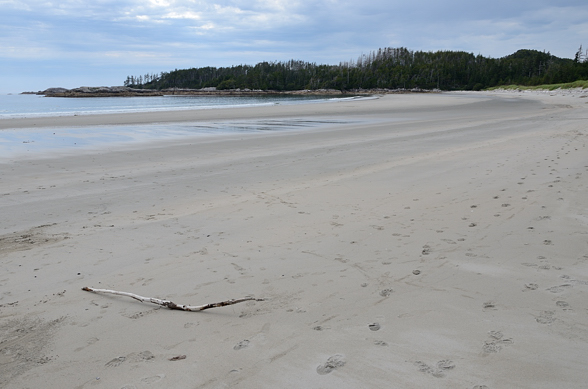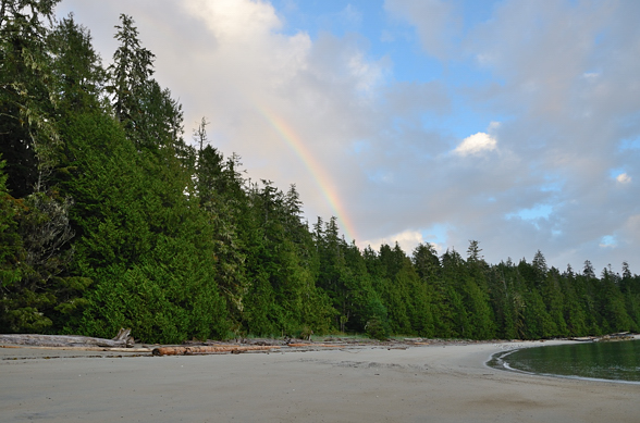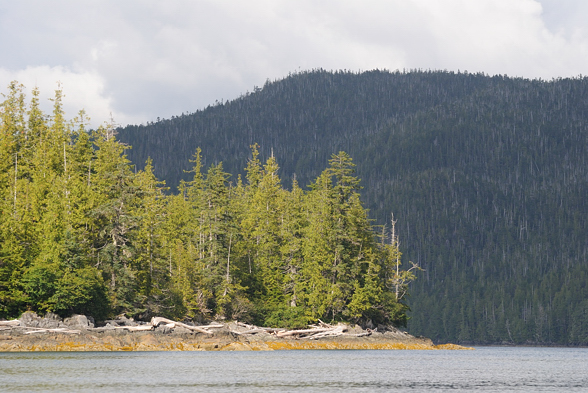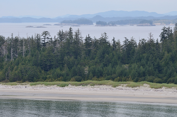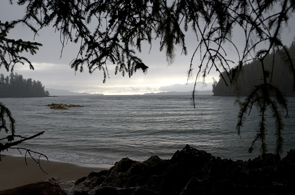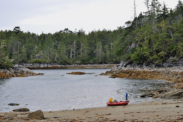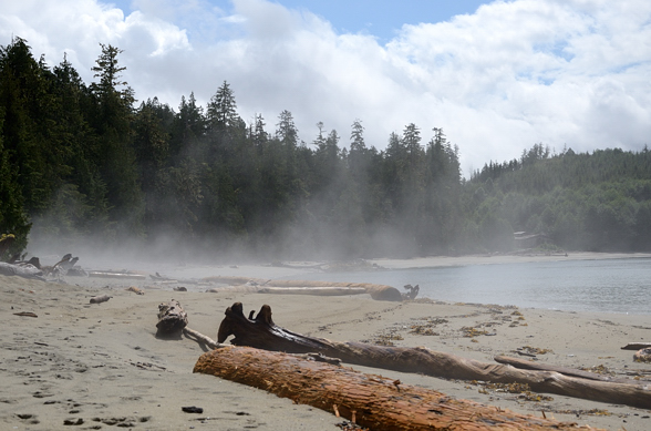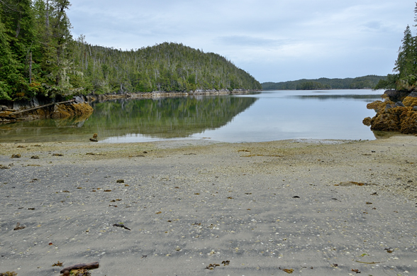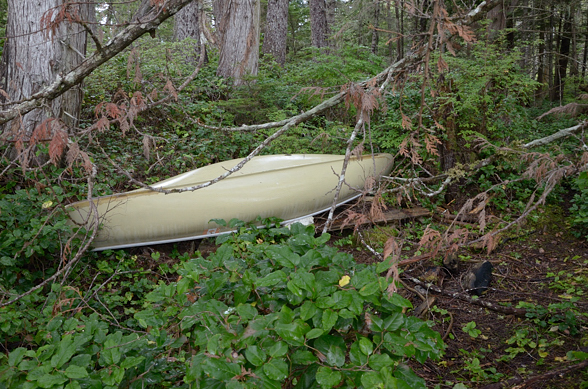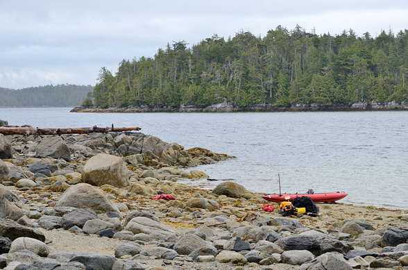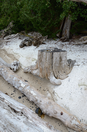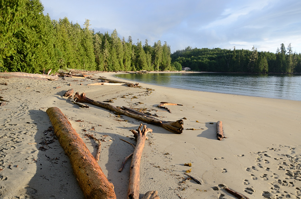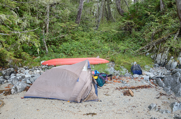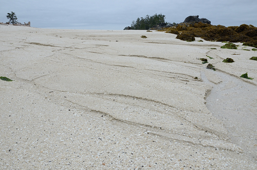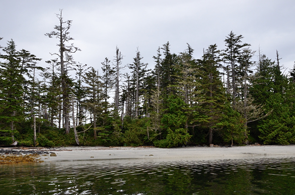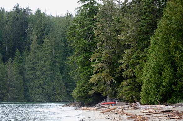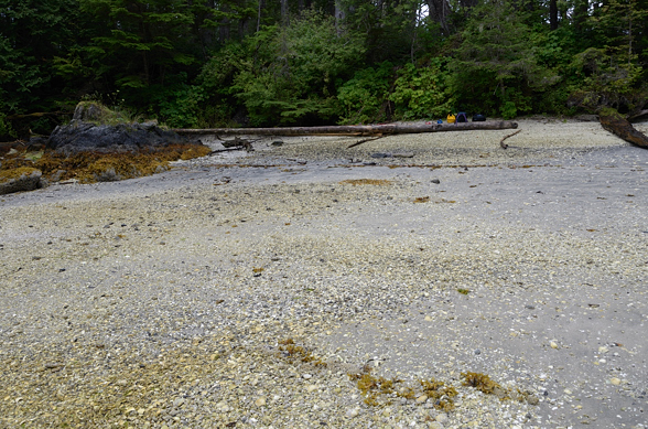 The upper tide line being encroached by forest was also thick shell deposits. Another reason this is a great camping beach is that there is a very sheltered tent site above the beach amongst the cedars, out of the weather.