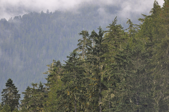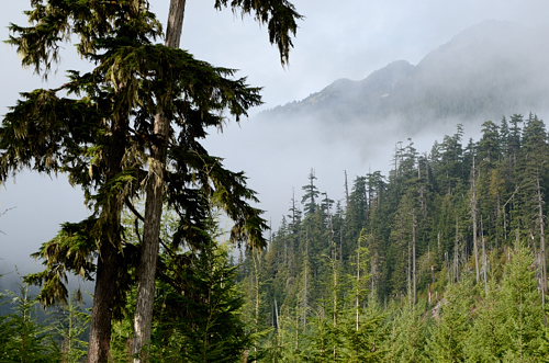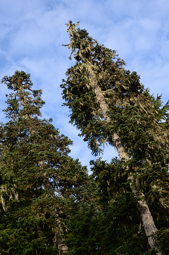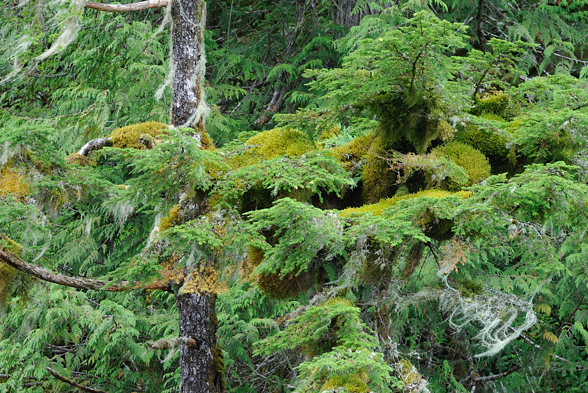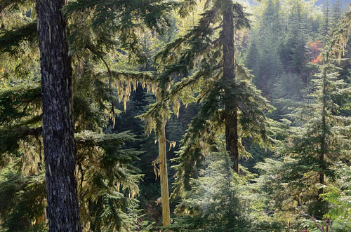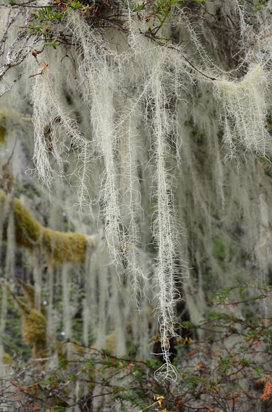 Finally near the Lick Creek headwaters it levelled off a bit in this interesting yellow lichen-encrusted forest.