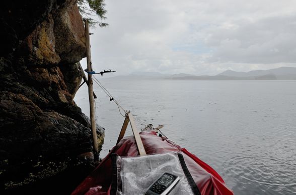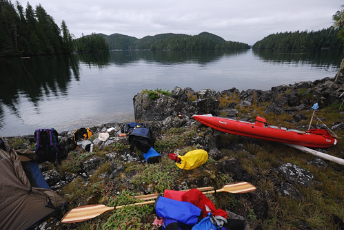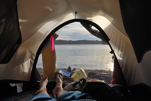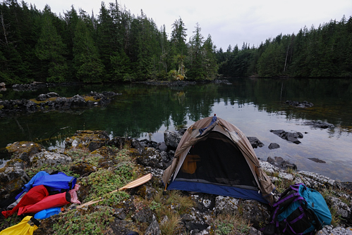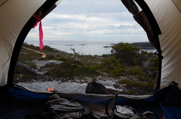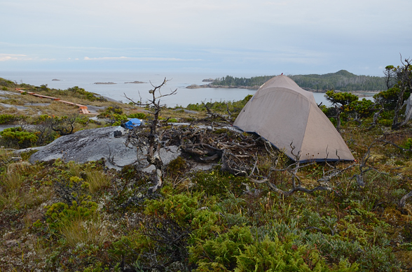 I rounded the bend into the bay at Blair Island and found a little islet with some fairly flat rocks. The time was 5 pm and I hadn’t seen any other suitable camping spot for a while, and there didn’t appear to be much further on either, so I called it a day. Back to sleeping on angular rock outcroppings…