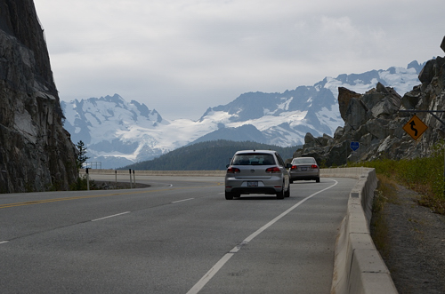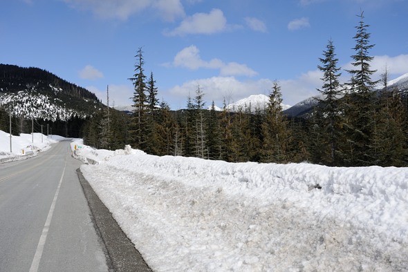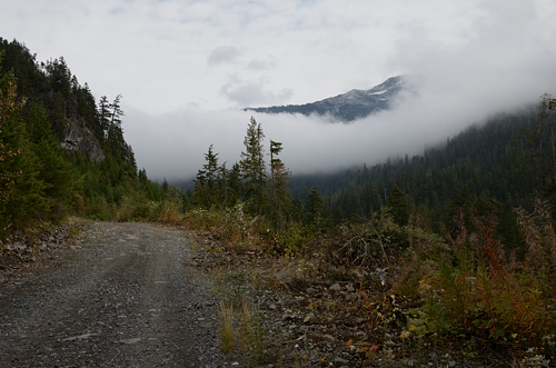 As I rounded the valley the road levelled off a bit. That’s Cloudburst Mountain poking through the clouds.