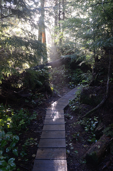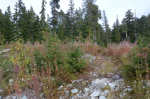 Since logging roads go up to the pass from both sides, the Cheakamus and Squamish valleys, and almost but not quite meet, being only a kilometer apart, my intuition and Google Earth skills convinced me that there must be a way between the two valleys. My intuition proved correct, as this quad trail led from the cutblock through the old growth forest to the other side.