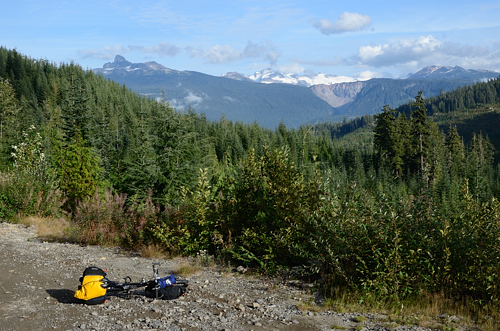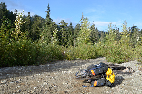 As I was beginning to get a really dry mouth and an uncooperative body I summitted the pass into the Squamish Valley. Whew! After some equally brutal, unridable descent I met up with the well groomed road.
