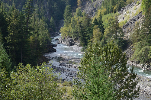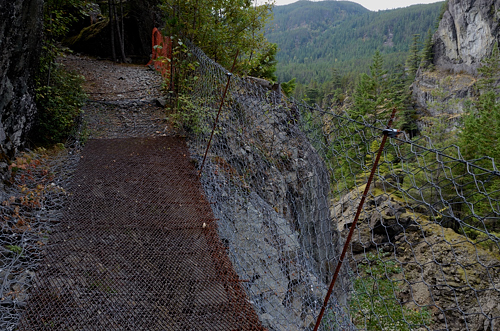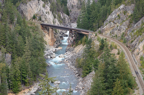 This is why the trail goes up to the highway and ends — an impassable canyon, and the railroad crosses the river. I am unsure if there is a trail going north on the west side of the canyon, following the railroad. It would be nice if there is since that means the highway section could be avoided.