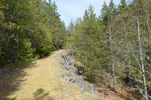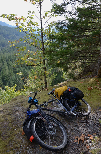 I took the “Lakeview Trail”, which actually only had about one view of the lake, filtered through the trees. It is fairly steep, going up and down along the ridge back south. It was nice forest and somewhat technical. Despite all the gear, the bike remained nimble; mostly due to the weight on the front being centred as close to the fork and bars as possible. I had the tire pressure too high but that was OK because I wanted to see what would rattle off, having just been put together.
