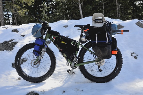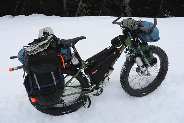 I found on my Mexico trip that the fat rims and tires felt very sturdy in rough places where I was hauling the bike over tortuous rocks. I’m sure I would have whacked narrower rims out of true in some of those places. So I generally prefer fatbikes for all kind of off-road touring, not just snow and sand. They aren’t the fastest bikes around but on my trips an extra 5% speed on the flats isn’t going to make much of a difference. It’s the rough spots that really add to the time and that is where a fatbike shines.