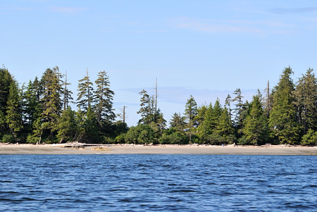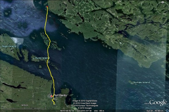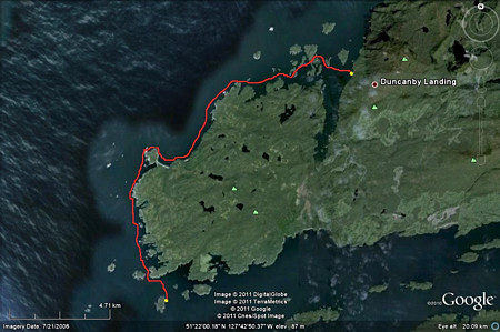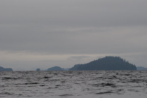 They were going to spend the night in Skull Cove by Bramham Island. I decided to push on back to the Southgate Group since that is the best jumping off point to cross the Strait. They said that they had seen sea otters in Skull Cove. That would be an interesting mammal to see, that I have never had the fortune of observing in the wild. They are working their way south, year by year, after being nearly exterminated by the fur trade many years ago. For some reason I didn’t go look for them. I wish I had spent a bit more time exploring the area before crossing back to Port Hardy; I had enough food.