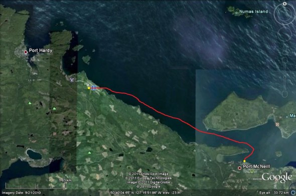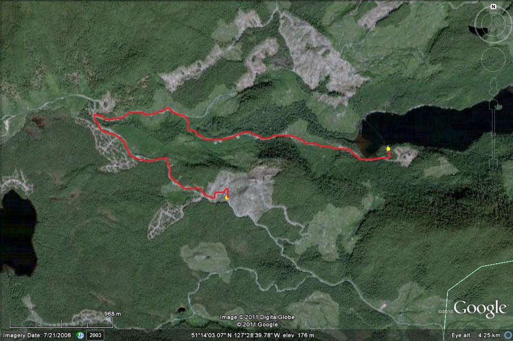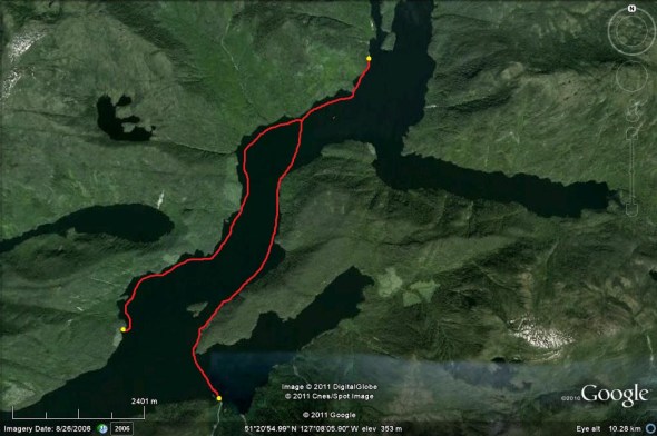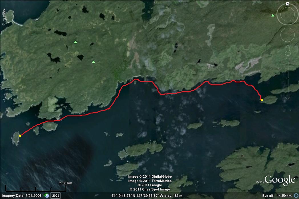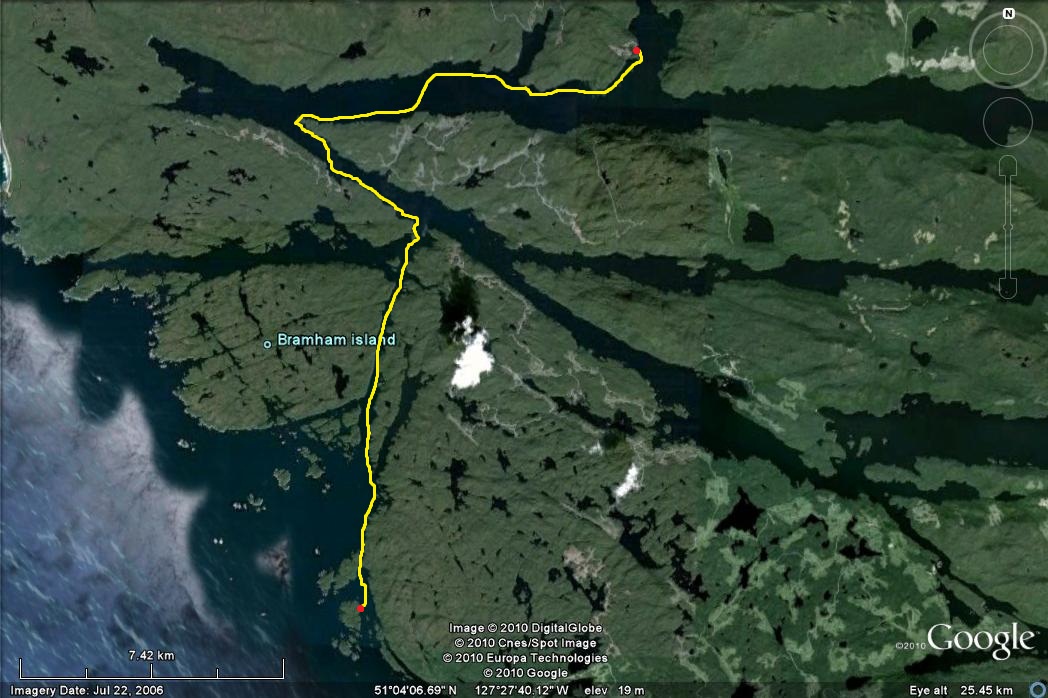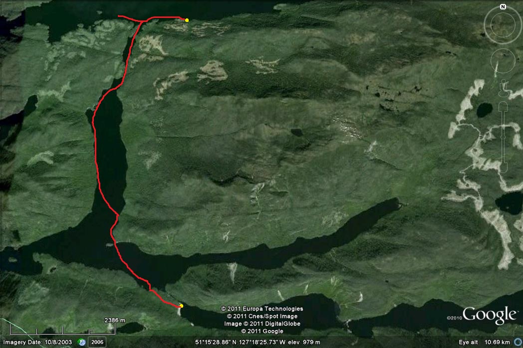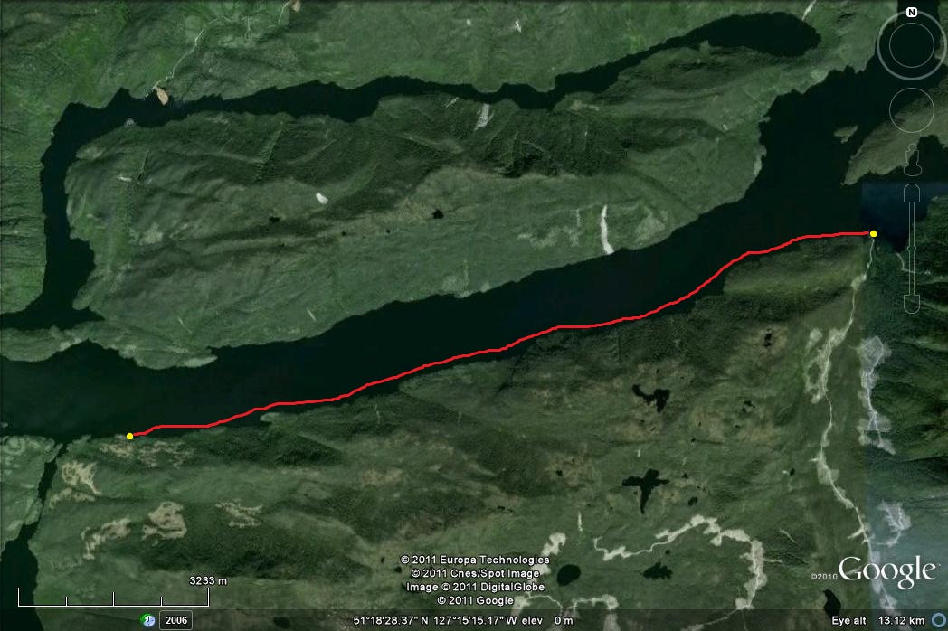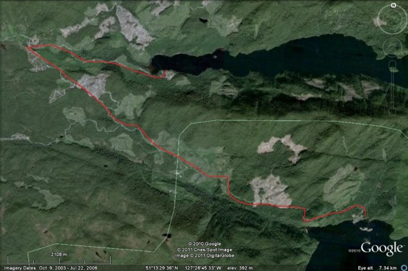 In reviewing Google Earth it seems that there are some logging roads leading from this floating camp across to Wyclese Lagoon, which is the “lake” (I’m not sure if it is salty or not) between Long Lake and Smith Inlet. So, if I could walk along this road then I should be able to avoid any bushwhacking. It is 12 km long and I have contacted the Ministry of Forests who says that it should be passable. The only problem is this report which I remember from when I first wanted to go on my trip a couple years ago. So, remember yesterday when I said that we have little to fear from bears … well, apparently that’s not true here…. It seems that this bear was hanging around this very area through which the road goes. Hopefully it will have moved on by then, and I don’t know why those forest workers didn’t have bear spray with them.