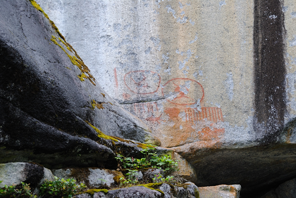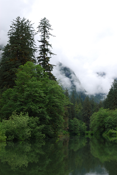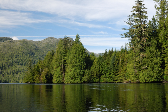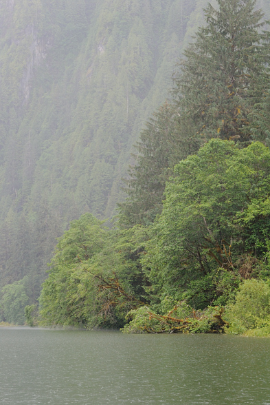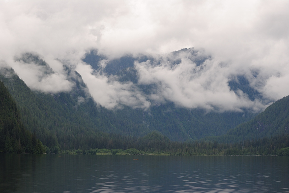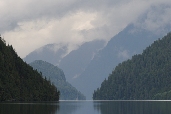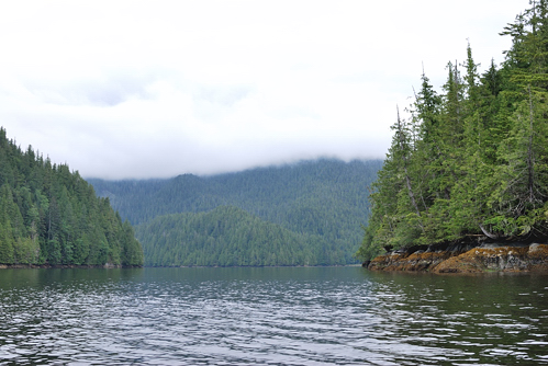 I entered the main channel of Belize Inlet and the fog was still very thick. At times when going from point to point across bays, I couldn’t see the point I was heading for. Eventually the fog began to lift and I saw a pleasure boat ahead across the channel. This was a welcome sign after being alone for so long. I crossed over to the south side of the inlet and went back around Mignon Point.
