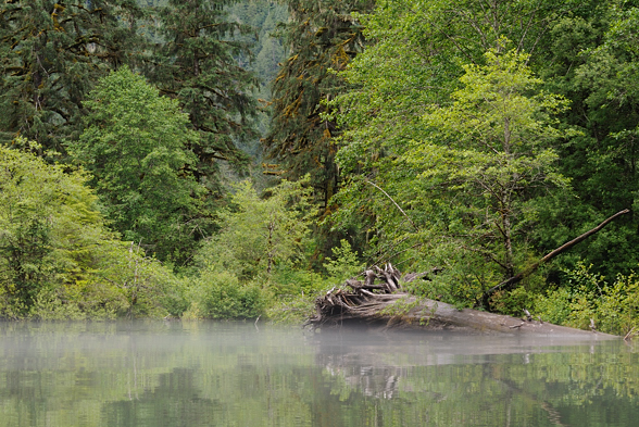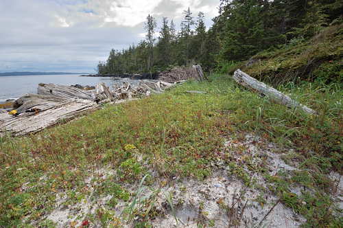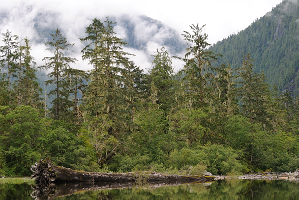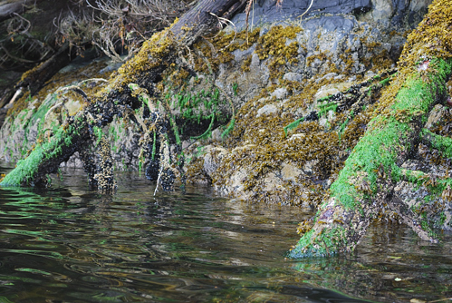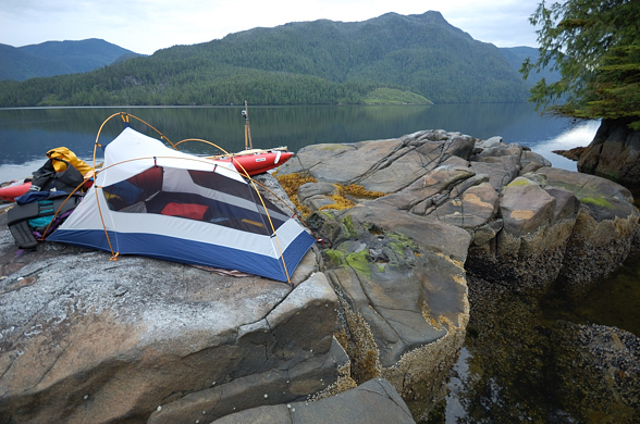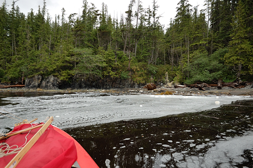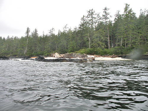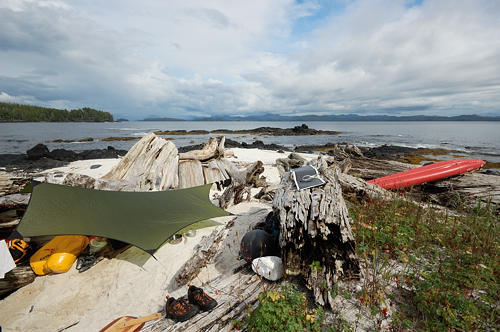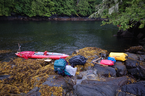 I landed in the little channel, which turned out to be a bit surgy. But I got my stuff up OK. I set up my tent and did my usual stuff. There was a LOT of rope washed up here. The fog was also now extremely thick. At times I couldn’t see the log boom which couldn’t be more than 150 meters away. The interesting thing about this thick fog was that it was condensing on the vegetation and making rain. It really was coming down like light rain. There was a hemlock tree near me and this was dripping onto the rocks and filling a pool in the rock near my tent. Everything was soaked. This is what nourishes the coastal redwood forests of California. They can go a long time without rain in the summer but the coastal fog condenses on their needles and “rains” down to provide water. This is also why these extreme coastal hypermaritime forests are so luxurient with moss and lichen. Even during long dry spells the vegetation gets nourished by fog condensation.