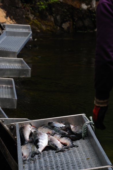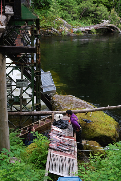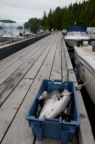 Lots of fishing charter boats came back for lunch with their catches. These are chinook and coho. I asked if there were sockeye and he said they are prohibited. Owekeeno has a big lake, which sockeye need as part of their life cycle, but the run was fished out a century ago. “You have to go to Alberni for sockeye”. Ironic how out here in the wilderness the sockeye are in worse shape than in Alberni. Although Long Lake had a nice run the previous year. I’m sure we’ll pounce on that soon enough.