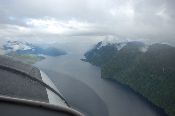 It was a little hard to figure out where we were going with the clouds but it turns out we were headed up Belize Inlet! That’s the empty logging camp I stayed at the first year when I was heading back out across to Port Hardy!