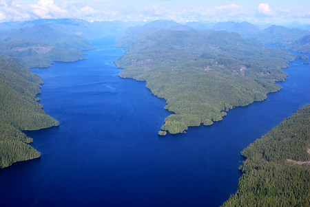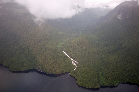 Looking east up Mereworth Sound from above the logging camp where my portage last year started (to the left of frame). Then we flew up Mereworth, where you’re looking. It was a great treat to be flying over the places I had paddled previously. I thought we might fly over the pass to Long Lake where my first failed bushwhack attempt took place. But then we turned around. I’m not sure why we took this detour. Maybe the pilot thought we could get over to Owekeeno faster via Long Lake but then decided the clouds were too low.
