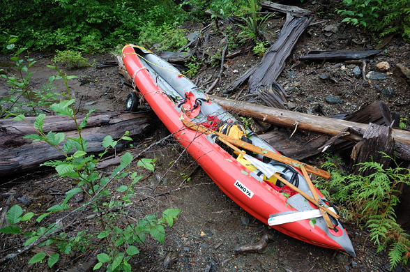 But beyond the unpleasant devil’s cub, the added bonus here was that it was growing out of a pile of downed logs which I had to cross. These created a false ground about six feet above the real ground. I could walk across it, but if I slipped I could be in trouble. But first I had to fling myself and my stuff five feet up onto the first log. Luckily there was a big red berry elder stem which I could grab hold of and swing off of, up onto the log. Oh yeah, and I was wearing my paddling gloves which really helped with hand protection.