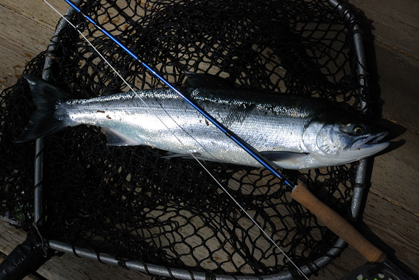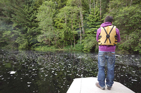 After this island I stopped at a dilapidated log dump dock to stretch my legs a bit and a school of small fish was burning around, breaking the surface at random locations.