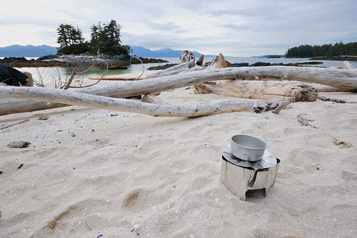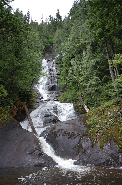 I filled my water bottles from the hose, dumping the water I got from the waterfall yesterday since I figured this water would be safer to drink, coming from a well I presumed. The waterfall was surface water which is more risky to drink without filtering. I also gave the flowers a water. I went on a salal berry picking excursion and had some oatmeal which was good. I never seem to get sick of that stuff. I packed up and gave my tent a shake. Unfortunately it had my little flashlight in the sleeve, and this fell out and landed in a crack between floating logs and down into the abyss. I really need to pay more attention to what I’m doing.