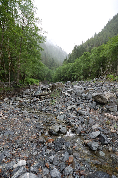 Every twenty minutes or so a small plane would fly overhead. I had been kept company by them for most of my time up Belize Inlet. I guess this is the main north/south flyway up the coast. And they even came up my little valley too, I presume because the pass is only about 320 meters elevation. I heard them throughout the day flying overhead, probably only a few hundred meters away, and maybe 500 meters higher. They had no idea what was going on beneath in that thick forest.