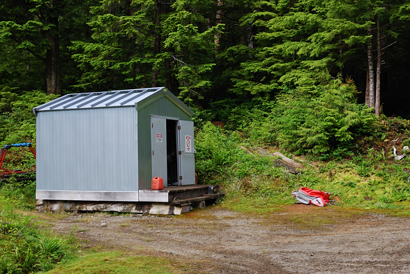 I was going to be in for a little bit of luxury tonight. This was a neat place to explore, with all the rustic floating cedar buildings. The important buildings were locked. There was a hose on the main dock, and in the hot sun, the water was warm. I had a hot shower! I also used the sunshine and set up my solar panel for a couple hours.
