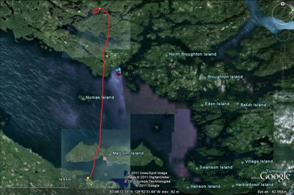 I asked them about the crossing and really just wanted a coordinate of the big island so in case I went off course in the fog I could make my way to that. After a few minutes of them digging for the chart I got it — 50 54’ and 127 31’. It was an interesting exchange, with them trying to negotiate the channel as they went down with the current, and me trying to keep up while I wrote the coordinates down. They were an older couple from Edmonton and had gone all over the coast in their boat. They were the first people I had spoken to in a couple weeks.