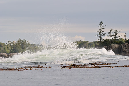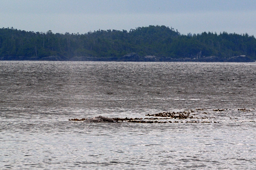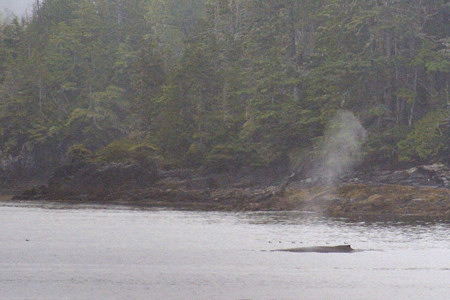Near the entrance to Schooner Channel the fog got thick again. I crossed over and headed down the coast. I was surprised by a big whale, maybe a grey, surfacing only about 50 meters away. I got a couple shots off but then put my camera away after it went down. And then it came up for its final surface and up came the tail. Damn, I missed it, except for one very blurry shot. I have to remember that for the future – the whale hasn’t gone down until the tail fluke comes up. Until then it is just taking small breaths and will come back up soon. But once it takes its big dive with the final tail kick, it could be down for a long time and resurface in some far off location.