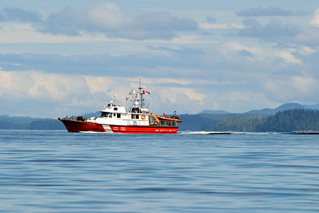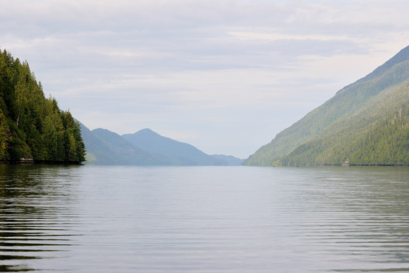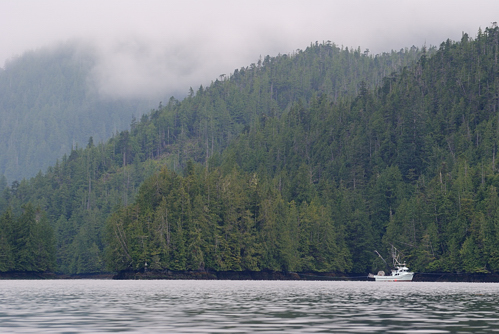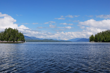 Looking across Rivers Inlet to the BC Ferry heading north along Calvert Island