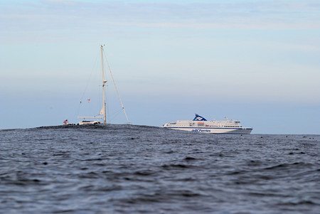I waited there for about an hour and filmed a lion’s mane jelly as it floated by. Eventually I decided that it was safe enough to run it, after one of those boats came up the rapids, and I rounded the corner. I zoomed along, past a sport fishing boat that was fishing right in the rapids. I don’t know why they chose that spot. They barely looked at me. I’ve noticed that out here; the sport fishing boats want nothing to do with me. The current moved me along pretty fast and I looked back and saw a sailboat milling around the entrance to the Narrows, and then it came through. It approached me and I decided to talk with them.