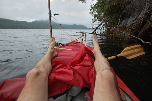 I continued down the coast and the fog got even thicker. I reached the islands and began following the shorelines looking for a suitable camping spot. I came upon a big log boom which was waiting in the sheltered bay behind one of the big islands, near to where I saw the big whale and calf on my way up. I considered camping on the log boom but then wisely decided that would be a risky move. But right across on the island adjacent to this was a relatively clear rocky knoll with a protected pullout that would fit the bill.