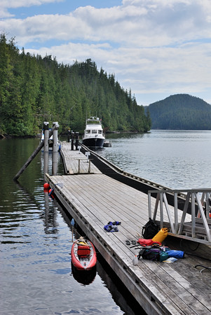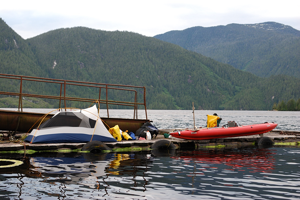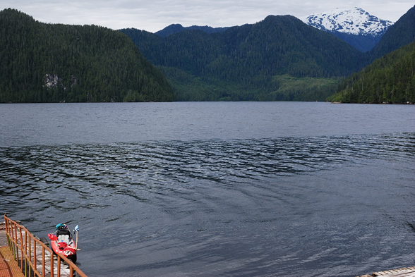 I returned to the dock and then had a chat with a native guy and his son who had emerged from their aluminum boat. I asked about camping on the dock and he didn’t mind. They had just come down from Prince Rupert and were here for the salmon run. I asked him about the weather up north in August and he said that it definitely can get stormy in August in the northern half and that it was probably not a good idea to risk it this late in the season. He talked about how rough Cape Caution can be too. So that made me feel better about my decision to call it quits. I thought I could instead return to Telegraph Cove and go on an organized grizzly tour up Knight Inlet, or paddle back to Robson Bight for a week. It was only a few hours away from my mom’s house by bus.