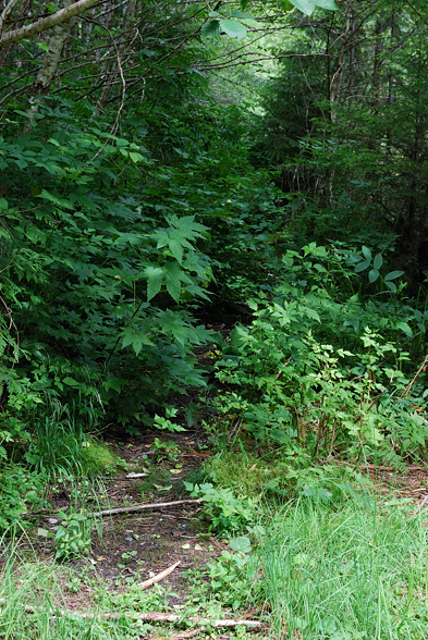 As I re-entered the forest I saw that I would not be able to escape an encounter with the infamous devil’s club. This is an extremely spiny shrub which grows via long spindly stems covered in spines and culminates in a whorl of equally spiny leaves. It only grows in wet spots with moving groundwater, which is one reason why I had been avoiding the lower wetter route.