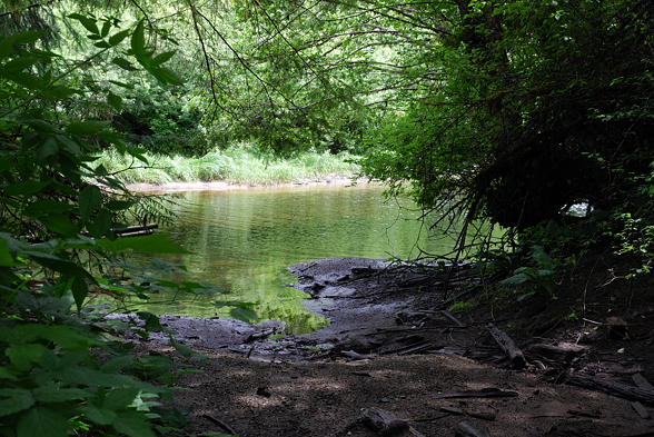 At the bottom of this steep hill it got brushier and I had to fight this and within a couple more runs I was back up on the bench by the creek. I could taste the end. I finally made it to the final run across the creek to the grassy beach. I decided to set up my video camera and get one shot of me hiking my gear. I’ll put it up later.